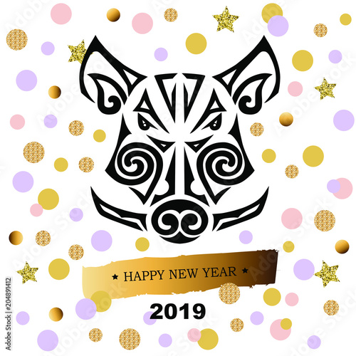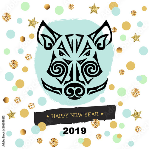 2019 New Year Card With Pig Or Boar S Head Template For Party